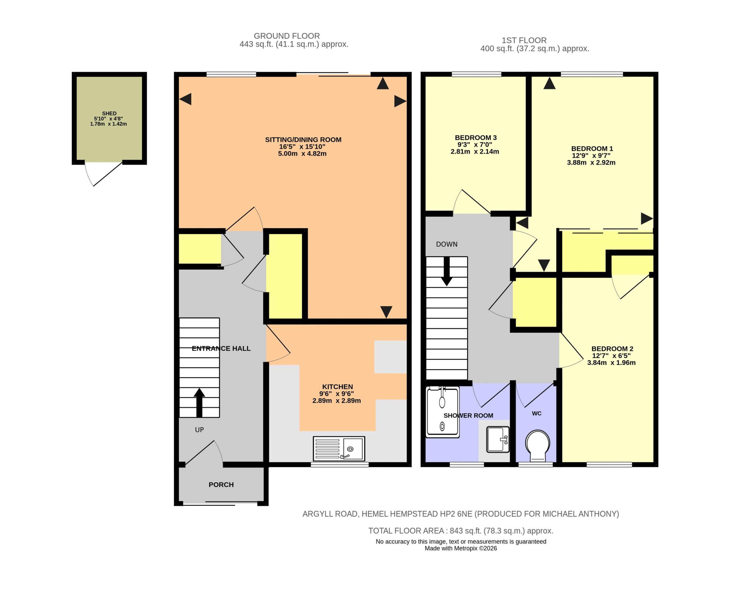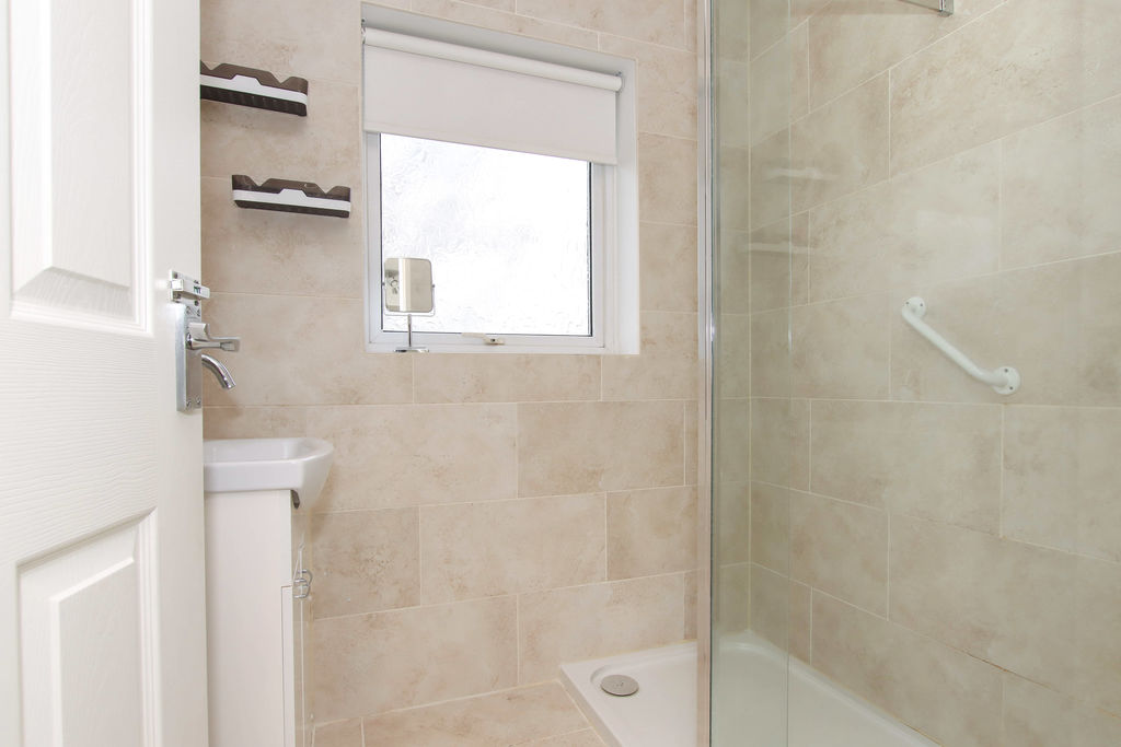 Frosted double glazed window to front aspect. Walk in shower, wash hand basin, tiled walls and floor, towel rail.