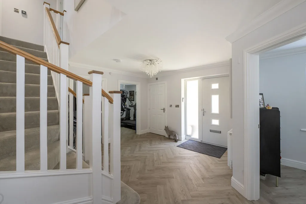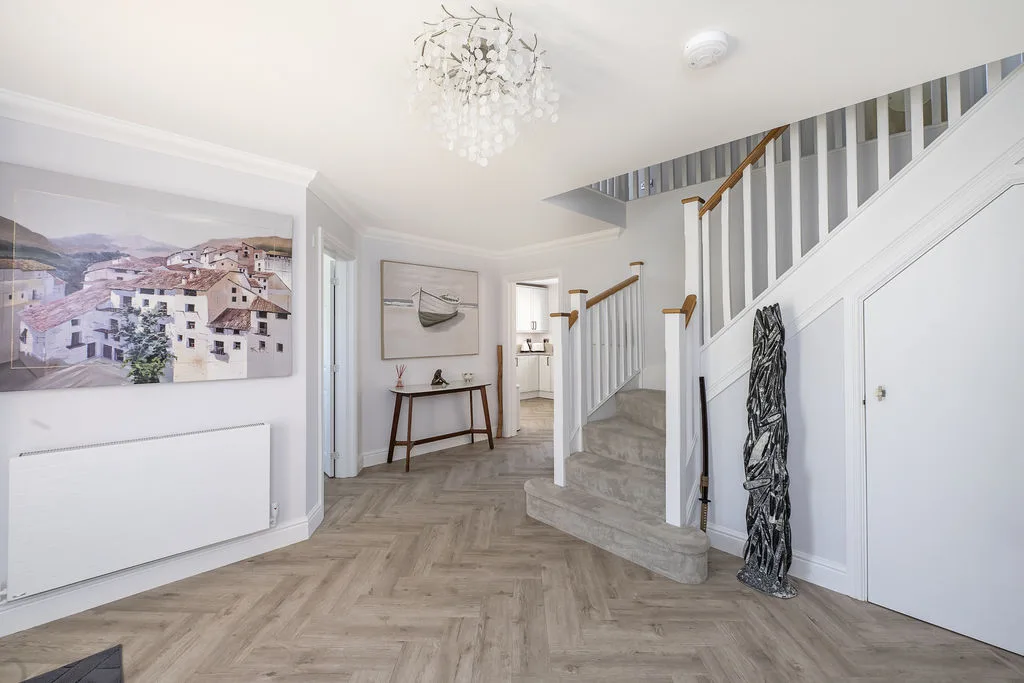 Stairs rising to first floor, radiator, under stairs cupboard. LVT flooring.