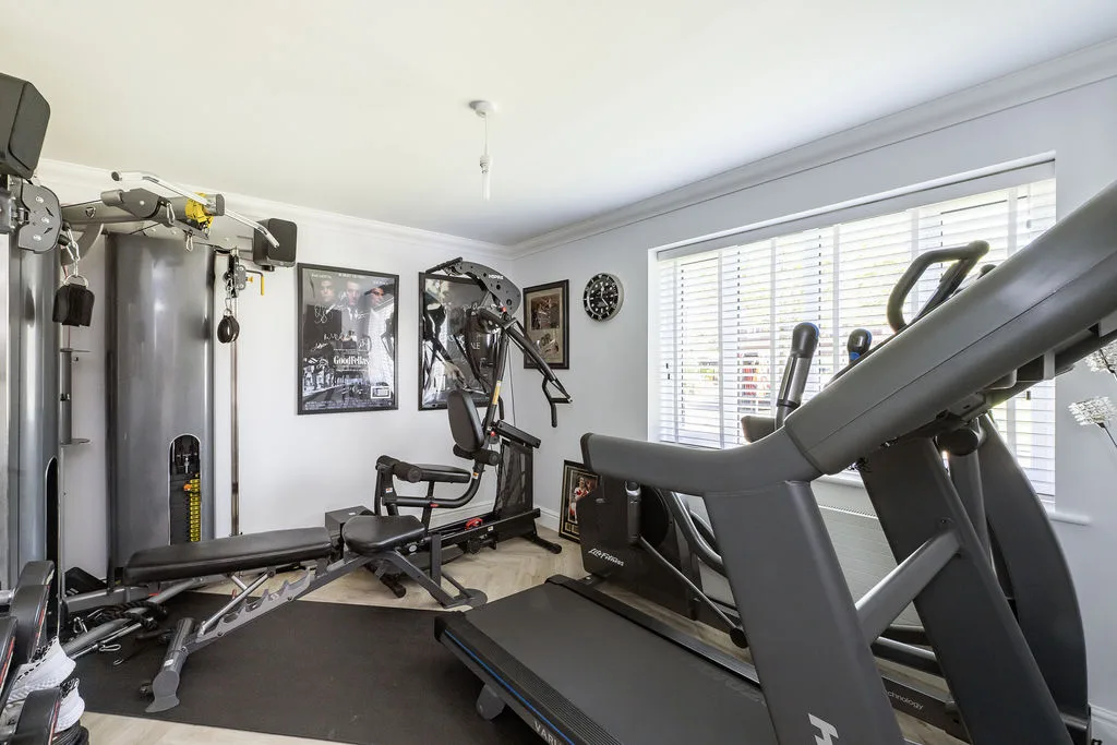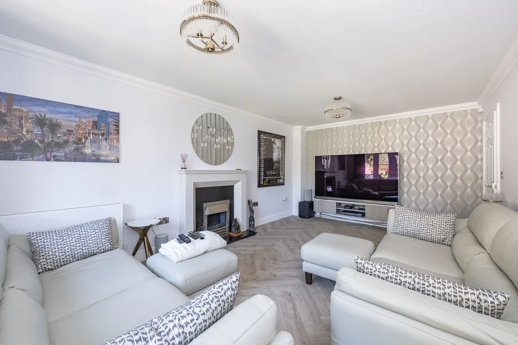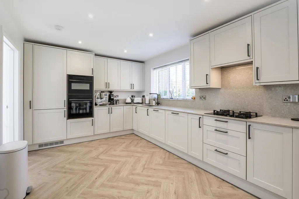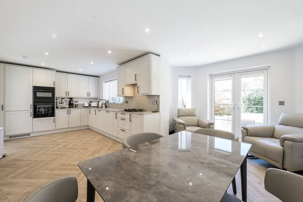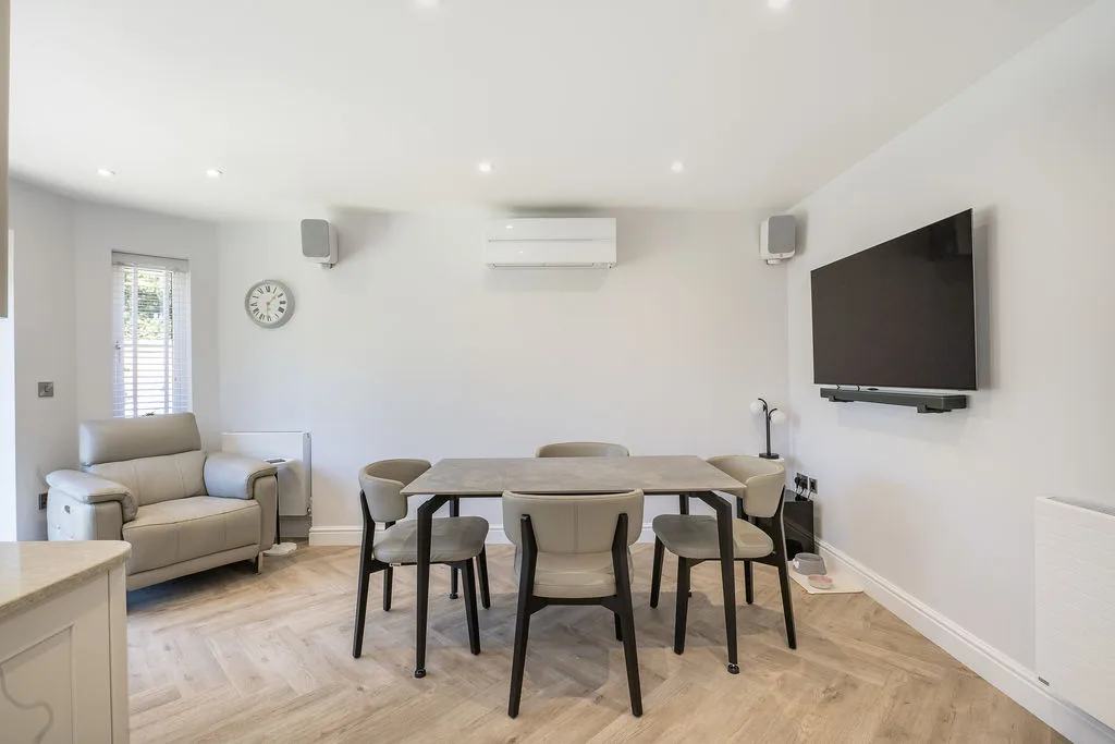 Two double glazed windows and double glazed French doors to rear. Recently refitted with a range of wall-mounted and floor standing units with Quartz work surface over, fitted sink with mixer tap and filtered water tap, gas hob with extractor fan over, electric oven, integrated fridge freezer, two integrated dishwashers, two radiators. Air conditioning unit. Door to