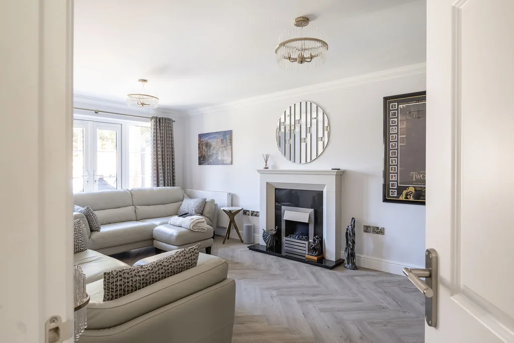 Double glazed French doors and window to rear. Radiator. Electric feature fireplace.