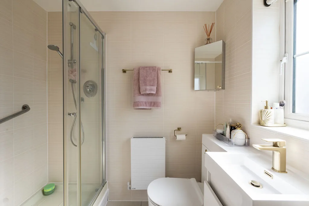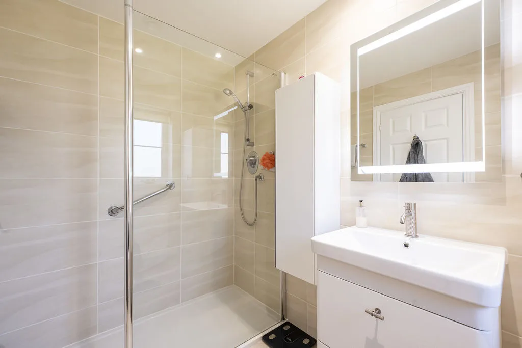 Double glazed frosted window to side aspect. Low level WC, wash hand basin with mixer tap, tiled shower cubicle, radiator.