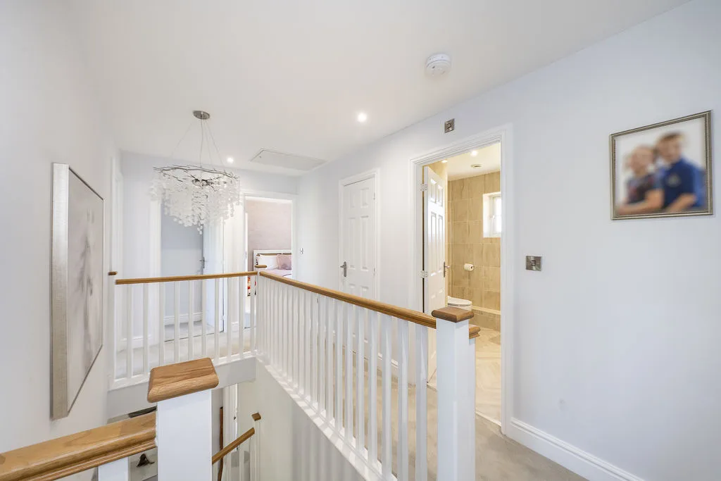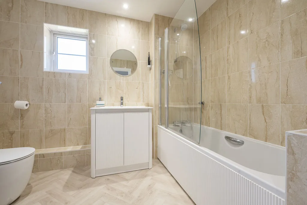 Double glazed frosted window to rear aspect. Low level WC, wash hand basin with mixer tap, panelled bath with shower over, tiled walls and floor, heated towel rail.