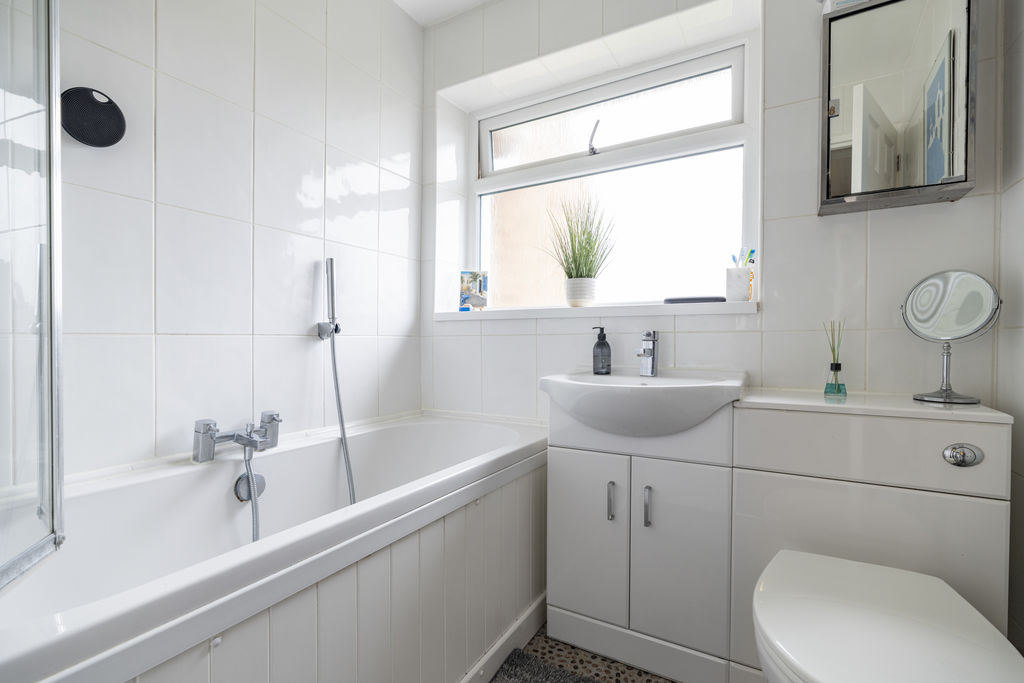 Frosted double glazed window to rear aspect. Heated towel rail, vanity wash hand basin with mixer tap, low level w.c. panelled bath with electric shower attachment over mixer tap and hand held shower attachment, fully tiled walls.