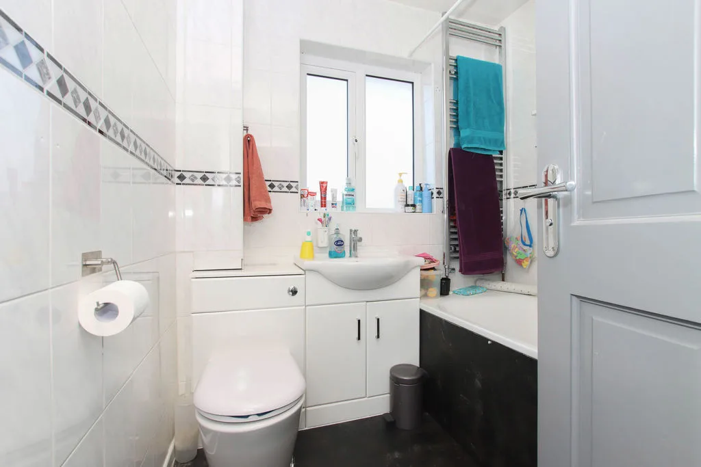 Frosted double glazed window to rear aspect, low level WC and hand wash basin in vanity unit, panel bath with shower over. Extractor fan, heated towel radiator, tiled walls.