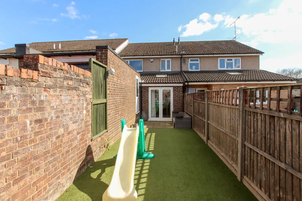 Low maintenance landscaped enclose rear garden with patio and artificial lawn, gate to rear. Outside tap and electric points.