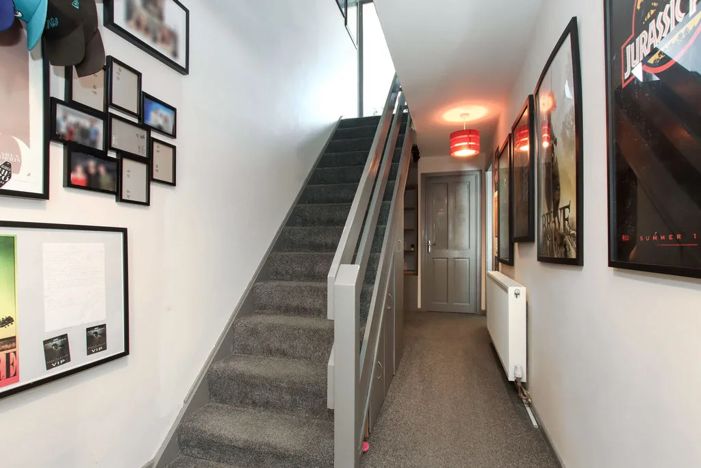 Stairs rising to first floor, radiator, built in storage cupboards, doors to cloakroom and lounge.