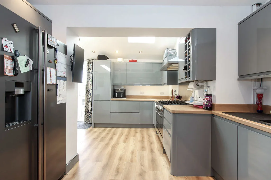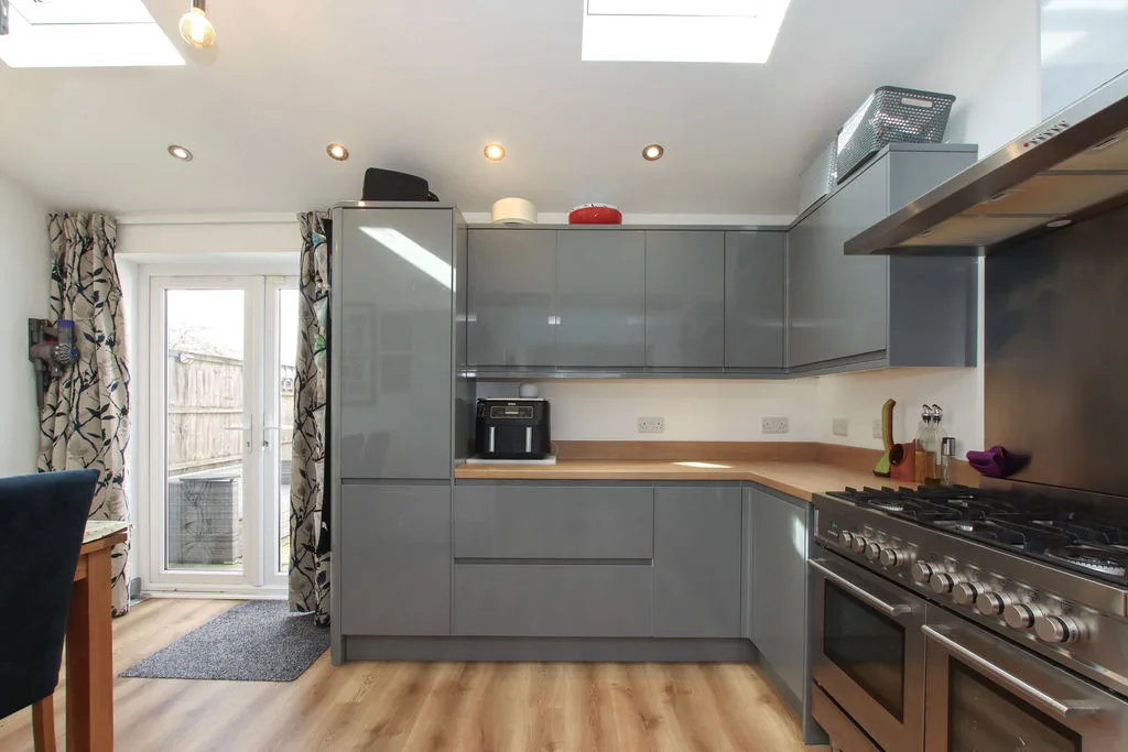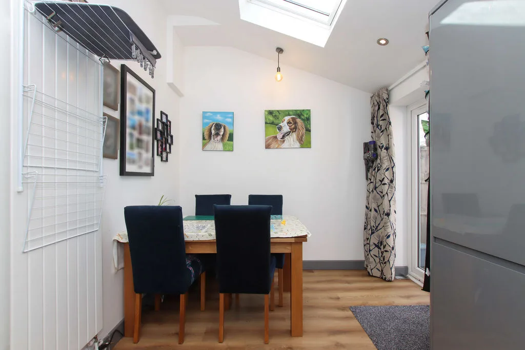 Double glazed doors to rear garden, two velux skylights, range of floor standing and wall mounted units with roll edged worktops over, one and a half bowl composite sink with drainer and mixer tap, space for range cooker, extractor hood, integrated dishwasher, space for washing machine and fridge freezer. Wood effect flooring, radiator.