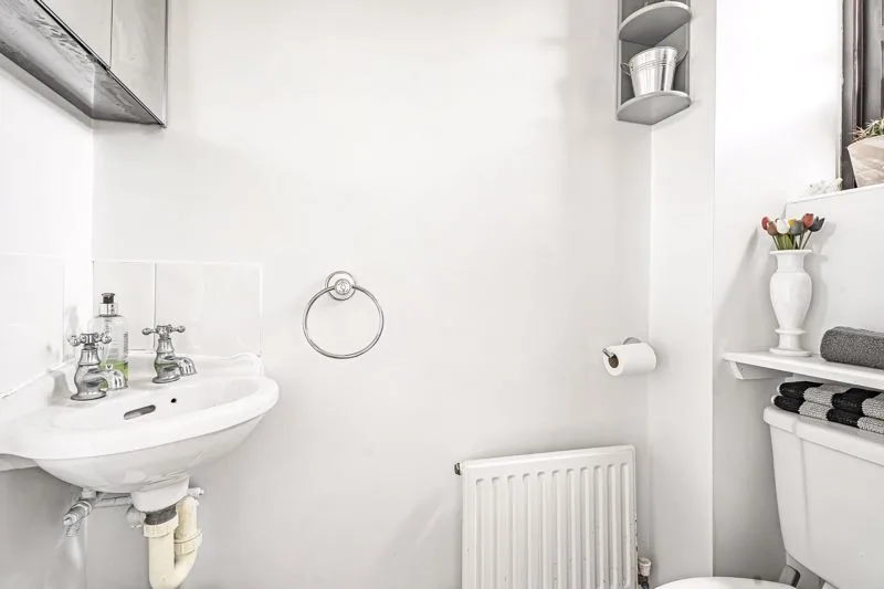 Double glazed frosted window to front aspect. Low level WC with push button flush, radiator, wall-mounted wash hand basin.