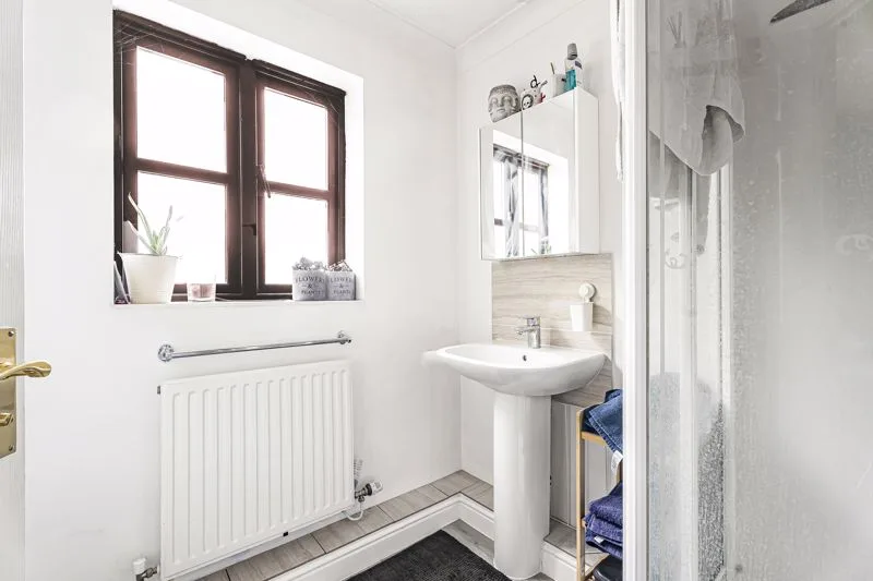 Double glazed frosted window to front aspect. Fully tiled shower cubicle, low level WC with push button flush, radiator, pedestal wash hand basin, extractor fan, splashback tiling.