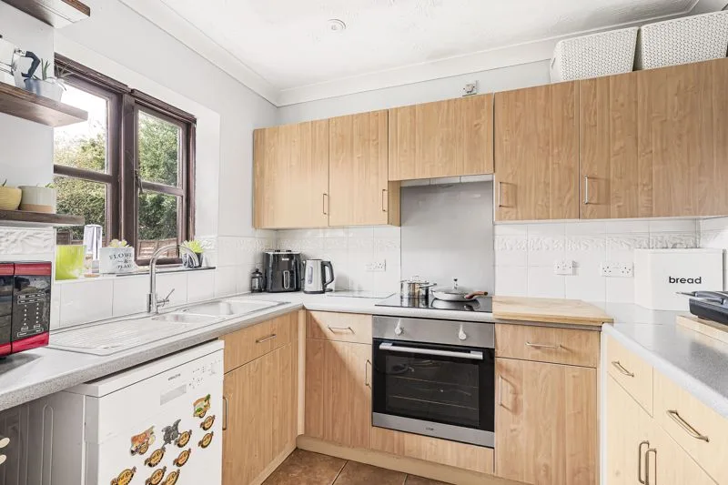 Double glazed window to front aspect. Fitted with a range of base and eye level units with rolled edge work surface over, oven and hob with extractor over, plumbing for dishwasher, splashback, one and a half bowl and drainer with mixer tap, space for fridge freezer.