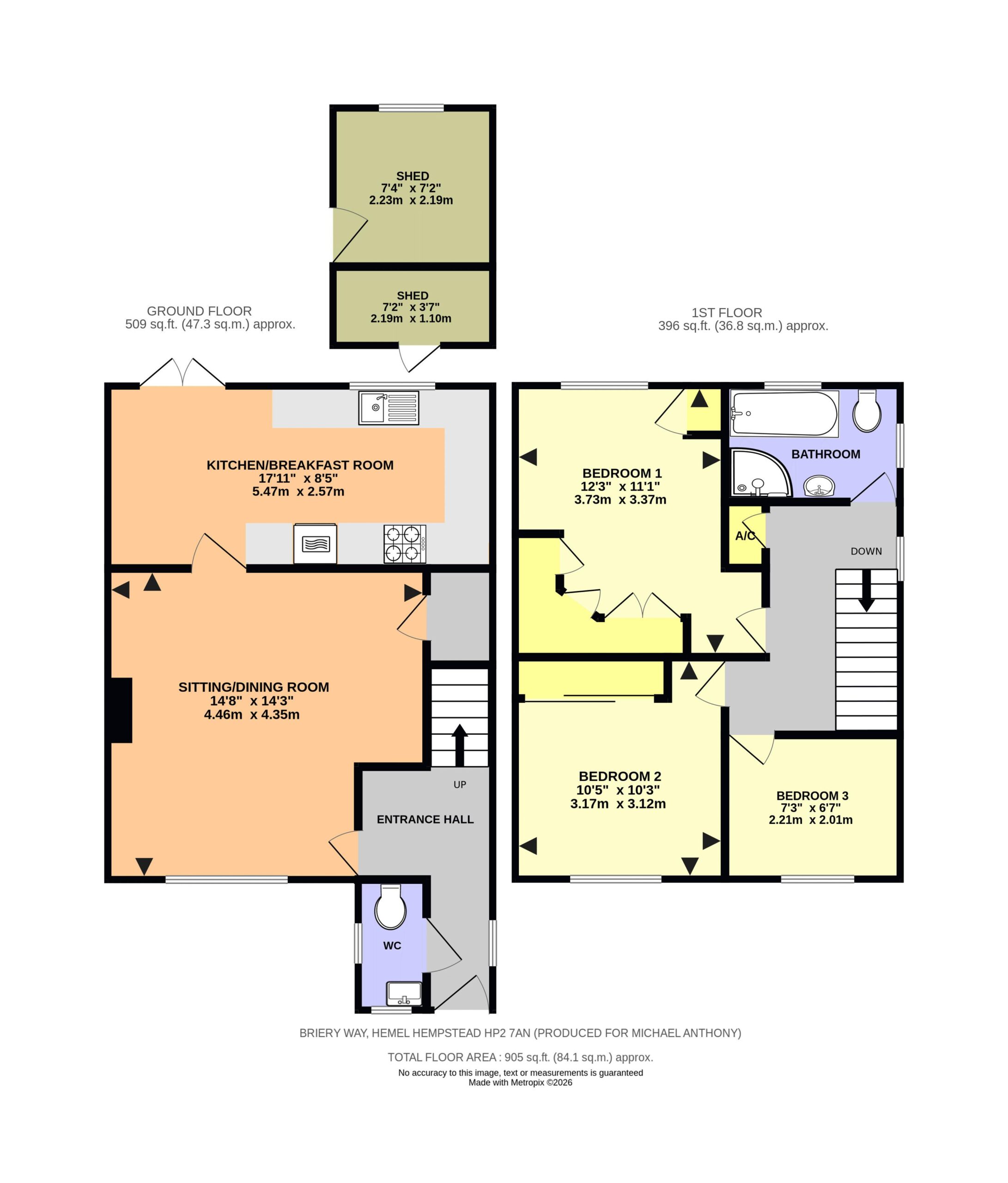 Brick built storage shed with power and lighting, timber storage shed, rear and side access gate, mature shrub beds, lawn and patio areas.