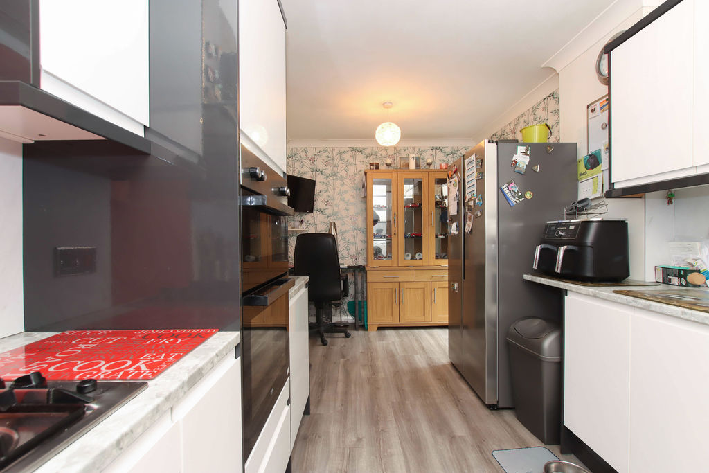 Double glazed window to rear, range of floor and wall mounted units, built in oven, gas hob with extractor fan over, space for washing machine, space for dishwasher, space for fridge freezer, radiator, door to garden.
