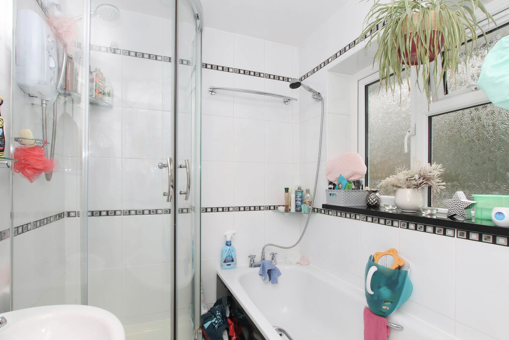 Frosted double glazed window to rear and side aspect, panel bath, shower cubicle, WC, pedestal hand wash basin, extractor fan.