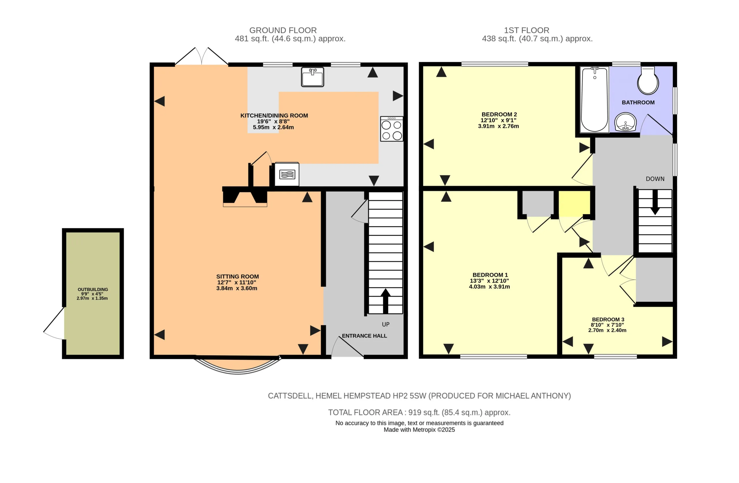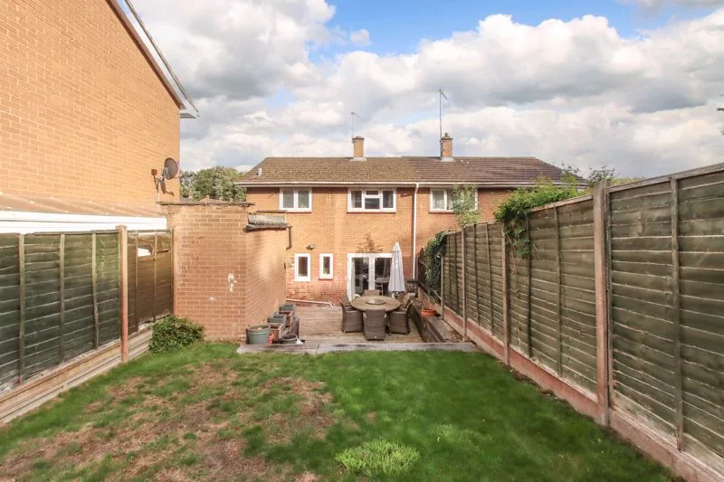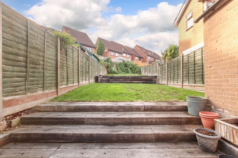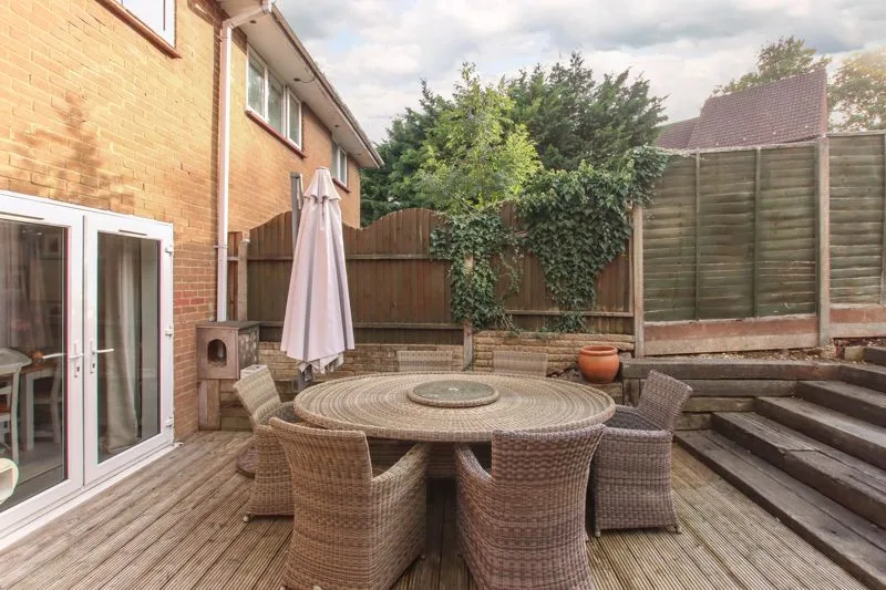 Decking area, tiered garden with lawn area, brick built shed, gated side access.