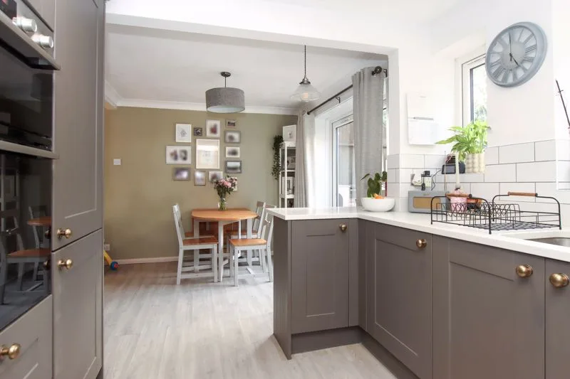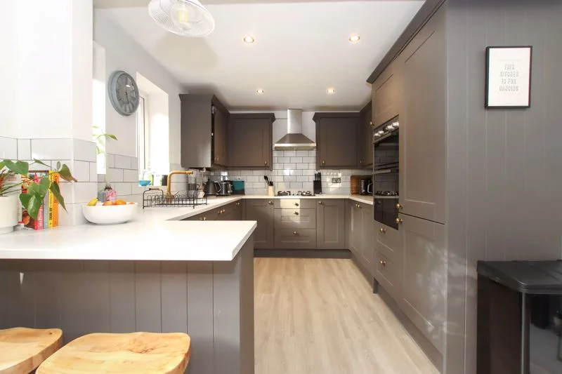 Double glazed patio door to rear and double glazed window to rear. Range of wall mounted and floor standing units with quartz work surface, breakfast bar, stainless steel sink with mixer tap, integrated oven and hob with extractor fan over, integrated washer/dryer, fridge/freezer and dishwasher, combination boiler, radiator, spotlights.