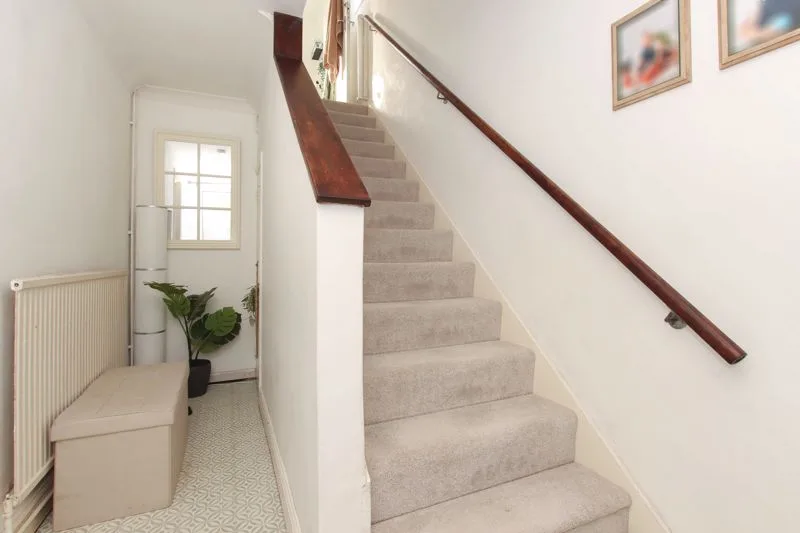 Stairs to first floor, understairs cupboard, radiator, door to lounge.