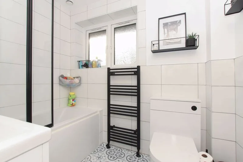 Frosted double glazed windows to side and rear aspects. Panelled bath with shower over, wall mounted wash hand basin with storage, low level w.c., towel radiator, spotlight.