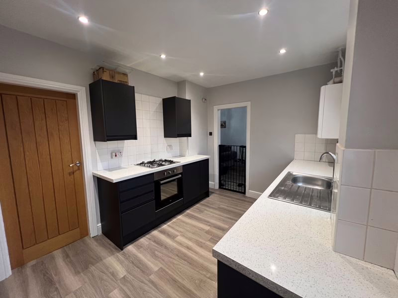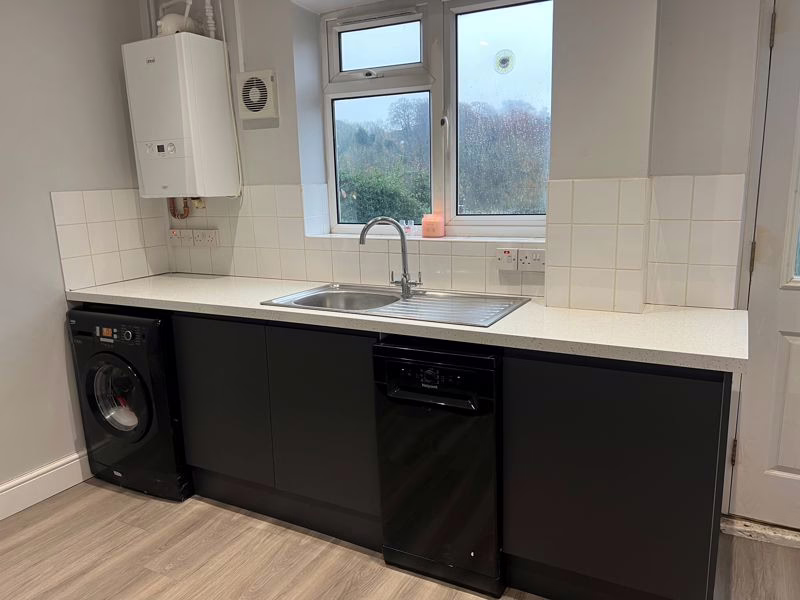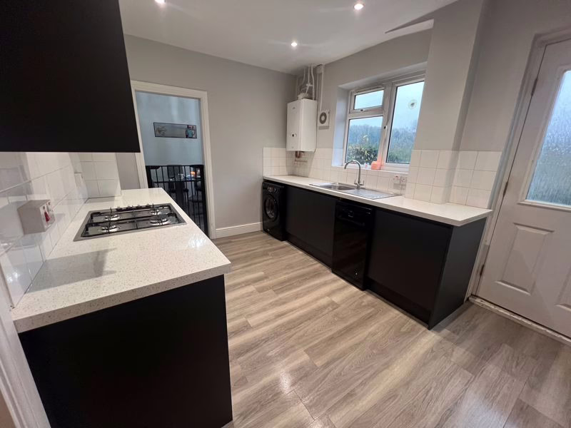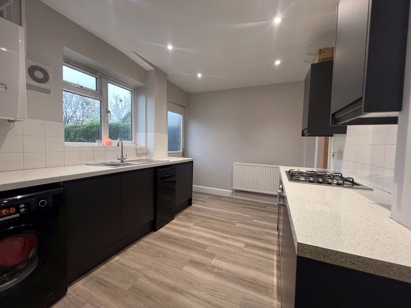 Double glazed window to rear aspect, door to garden. Fitted with a range of wall-mounted and floor standing units with rolled edge work surface over, space for: cooker, dishwasher and washing machine; stainless steel sink with drainer, boiler, spotlights, door to utility, radiator.