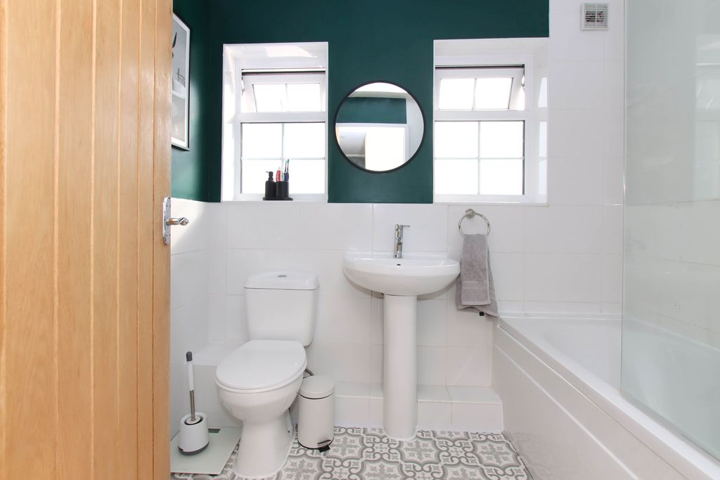 Low level WC, pedestal hand wash basin, tiled floor, double glazed window, radiator.