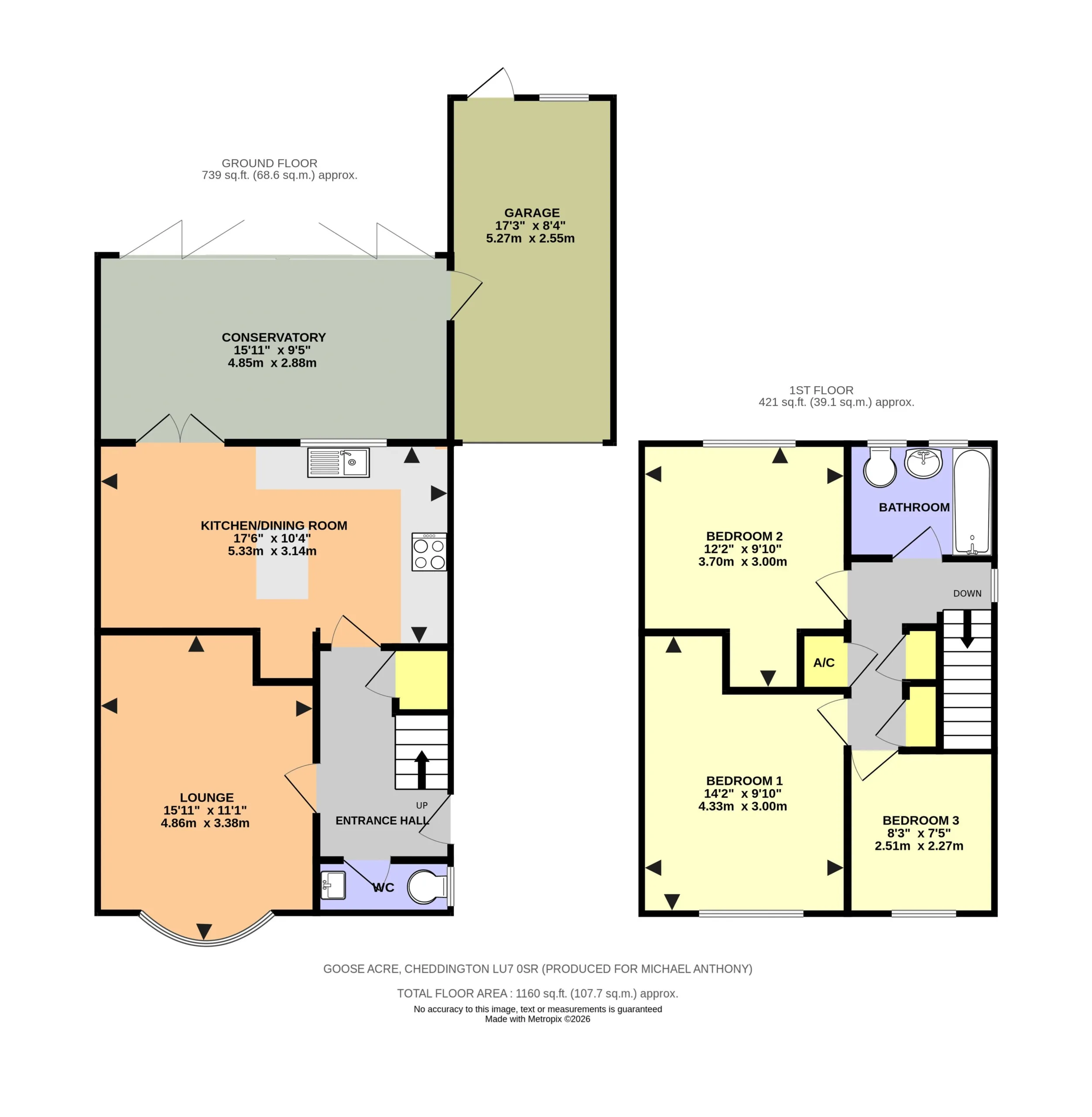 Up and over door, double glazed window to rear, power and light, plumbing for washing machine, personal door to garden.