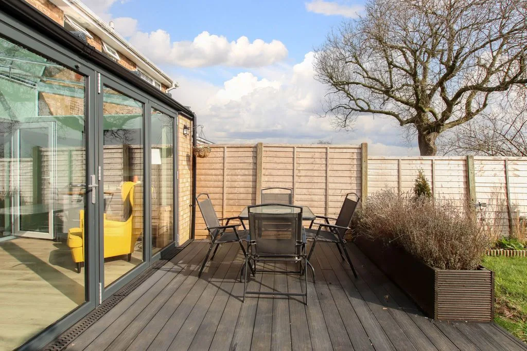 Mainly laid to lawn with composite decks and patio area all enclosed by panel fencing, outside lighting and cold water tap, and personal door to garage.