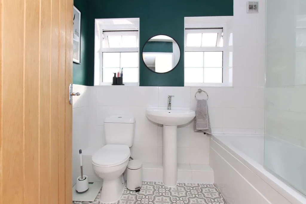 White suite comprising of a panel bath with shower unit over, pedestal hand wash basin, low level WC, tiled walls, tiled floor, two double glazed windows, radiator and heated towel rail.