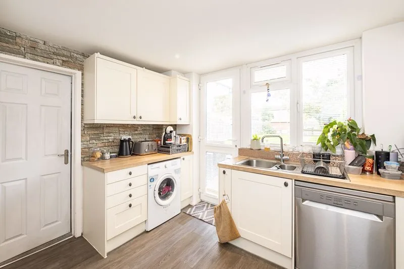 Range of floor and wall mounted units, space for washing machine, space for fridge freezer, space for dishwasher, gas hob with extractor fan over,1 1/2 bowl sink with drainer, built in oven, built in microwave, spotlights, double glazed window to rear, door to garden.