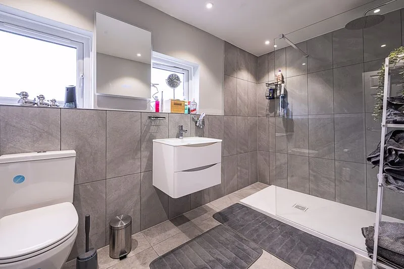 WC, heated towel rail, hand wash basin, walk in shower, extractor fan, frosted double glazed window to rear, part tiled walls, spotlights.