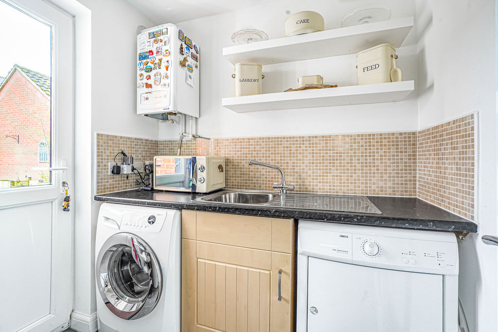 Double glazed door to rear aspect. Single drainer sink with mixer tap, floor standing units with roll edge work surface, wall mounted boiler, radiator, plumbing for washing machine radiator.