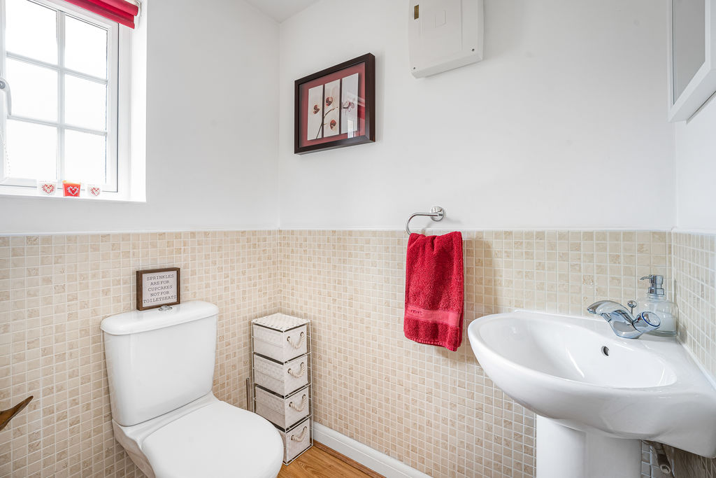 Frosted double glazed window to front aspect. Low level w.c., pedestal wash hand basin, radiator, part tiled walls.
