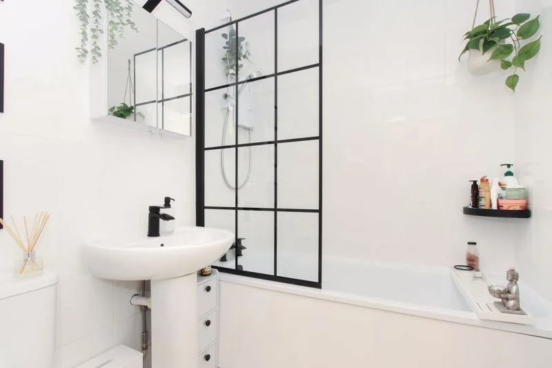 Low level WC, wash hand basin with mixer tap, electric shower, panelled bath with screen, electric towel rail.