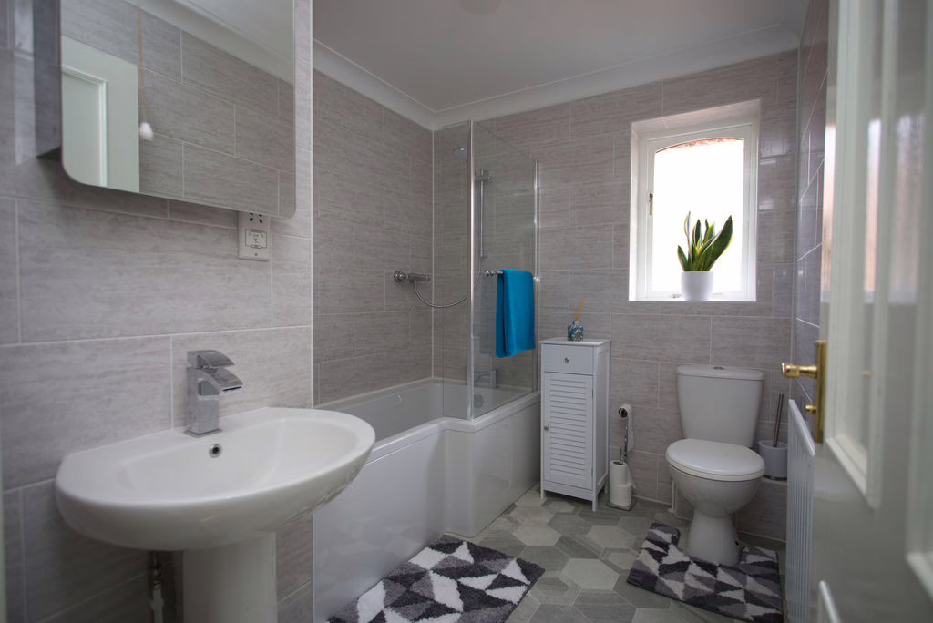 Double glazed frosted wooden window to side aspect. Low level WC, radiator, pedestal wash hand basin, P-shaped bath, power shower, tiled walls.