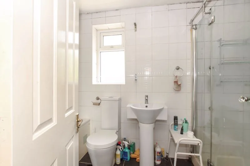 Double glazed frosted window to rear aspect. Low level WC, panelled bath with mixer tap, pedestal wash hand basin, tiled shower cubicle.