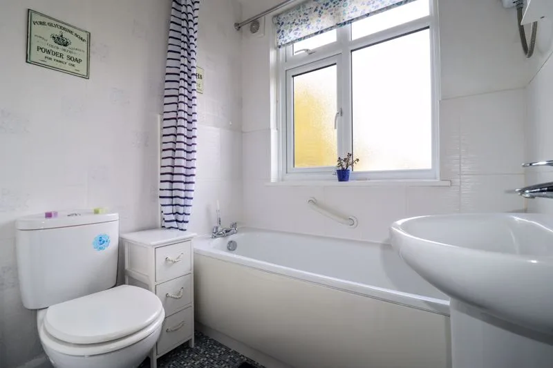 Double glazed frosted window to front aspect. Low level WC, wash hand basin with mixer tap, radiator, panelled bath with electric shower attachment over and mixer tap, part tiled walls.