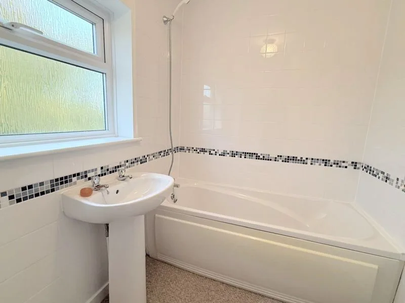 Double glazed frosted window to rear aspect. Pedestal wash hand basin, low level WC with push button flush, panelled bath with mixer tap and shower attachment, part tiled walls, heated towel rail.