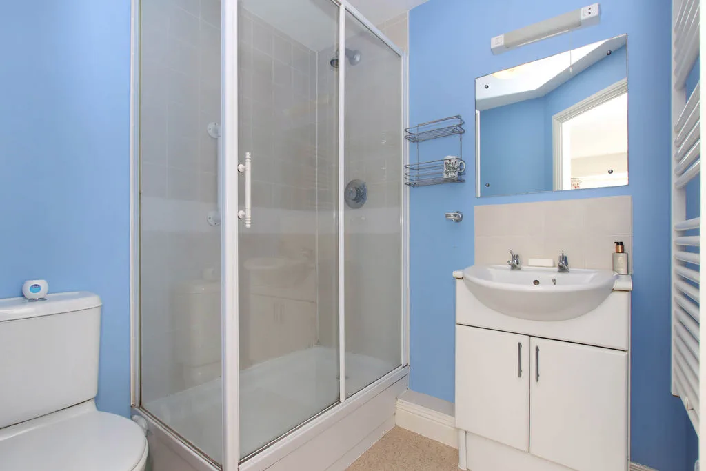 Tiled shower cubicle, low level w.c., wash hand basin, heated towel rail.