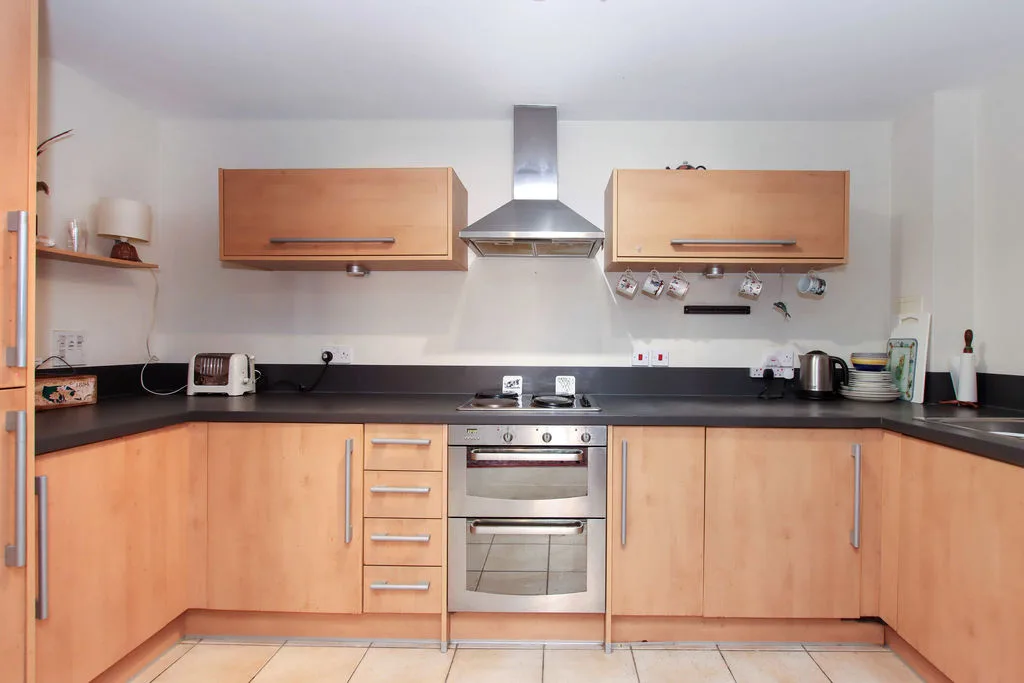 Wall mounted and floor standing units with work surface over, single drainer stainless steel sink with mixer tap, built in oven and hob with extractor fan over, integrated dishwasher, fridge/freezer and washing machine.