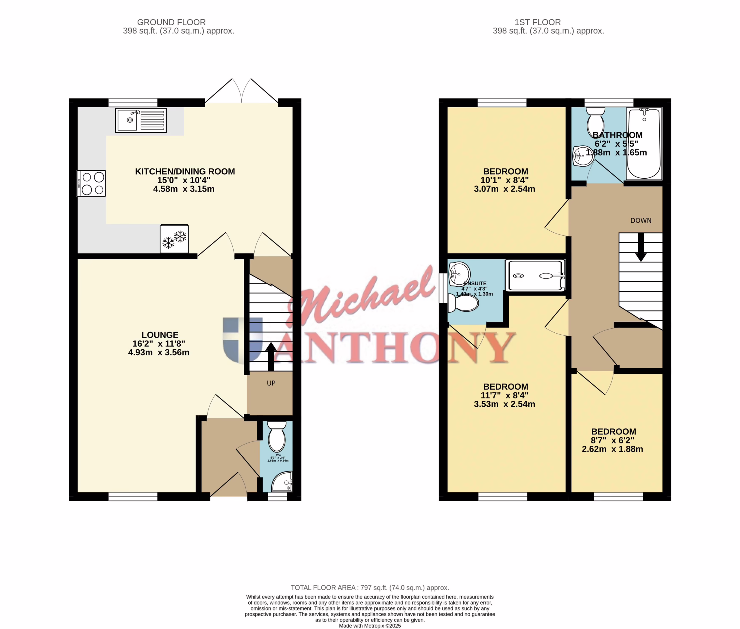 Double glazed frosted window to rear aspect. Heated towel rail, low level WC, pedestal wash hand basin, bath with power shower over, part tiled walls.