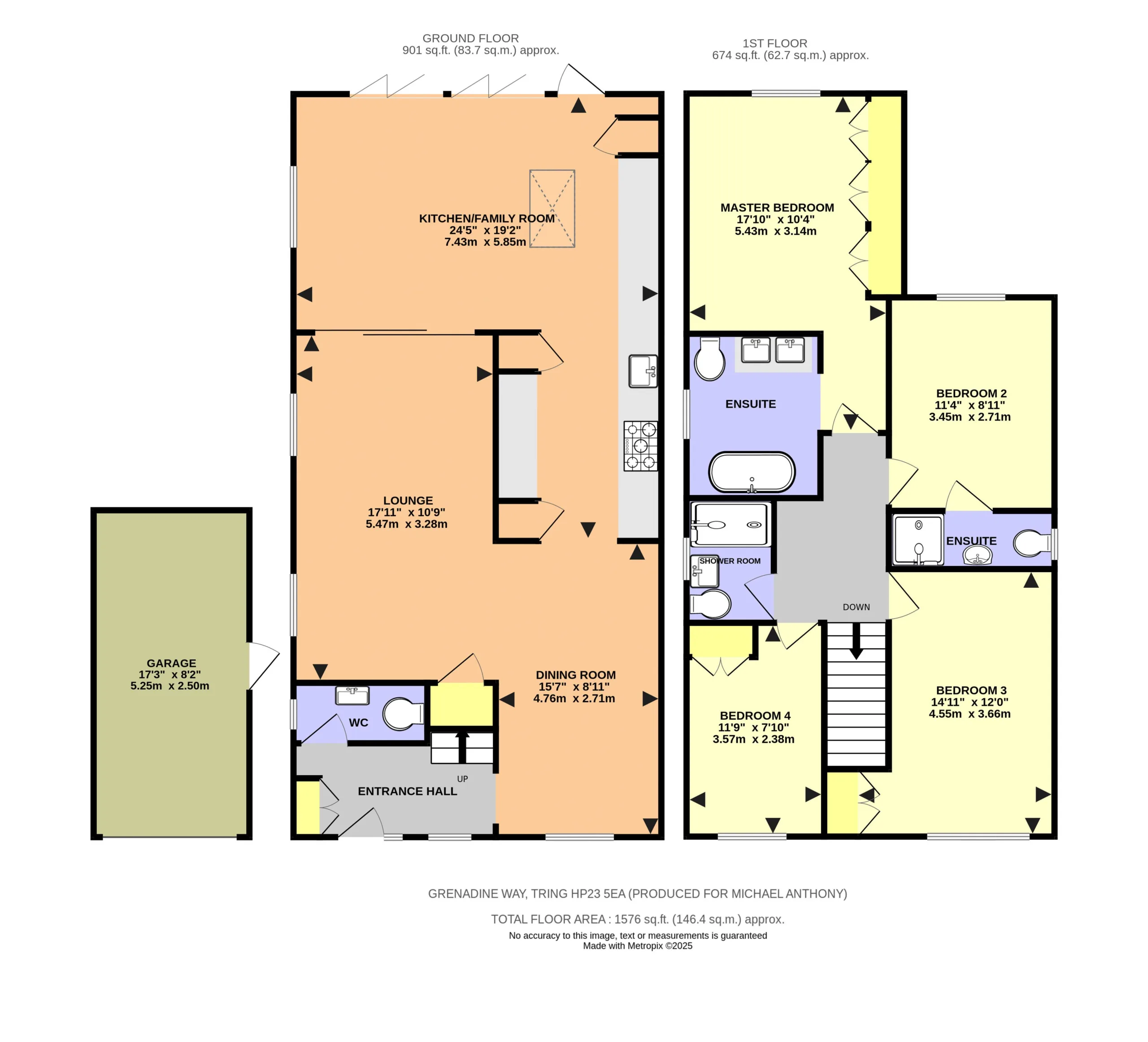 Double glazed window. Large tiled shower cubicle, wash hand basin with storage below, low level WC, heated towel rail.