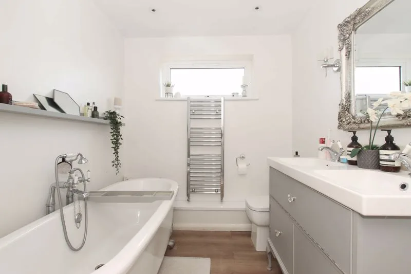 Double glazed window. Comprising ball and claw bath with mixer tap and shower attachment, twin wash hand basins with storage below, low level WC, heated towel rail.