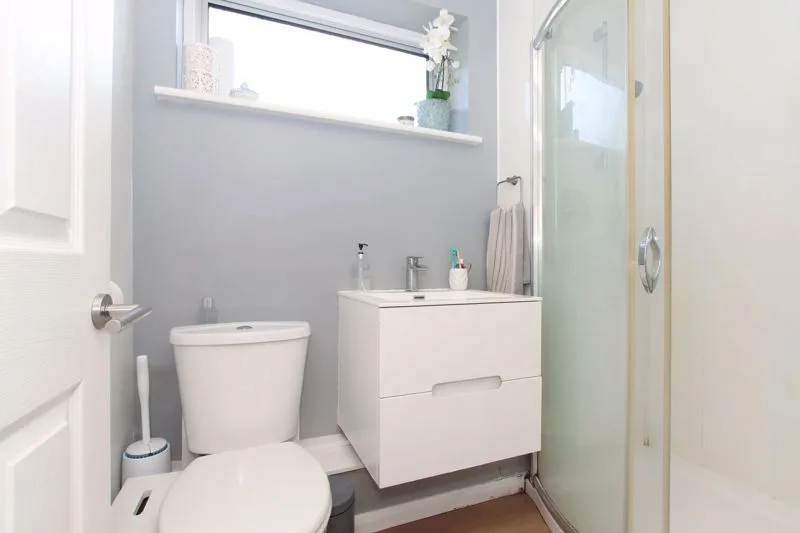 Double glazed window. Low level WC, wash hand basin with storage cupboard below, radiator.