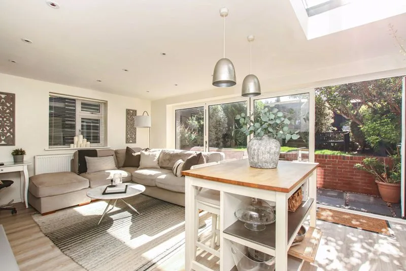 A wonderful open plan L shaped kitchen/living room fitted with a range of both floor and wall-mounted units with wooden work surfaces over, butlers sink with mixer tap, built-in oven and hob with extractor fan over, plumbing for automatic washing machine and dishwasher. Double glazed bi-folding doors and windows to rear, double glazed window to side aspect and double glazed skylight.