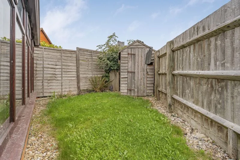 Mainly laid to lawn surrounded by panel fencing, flower and shrub borders, hardstanding area.