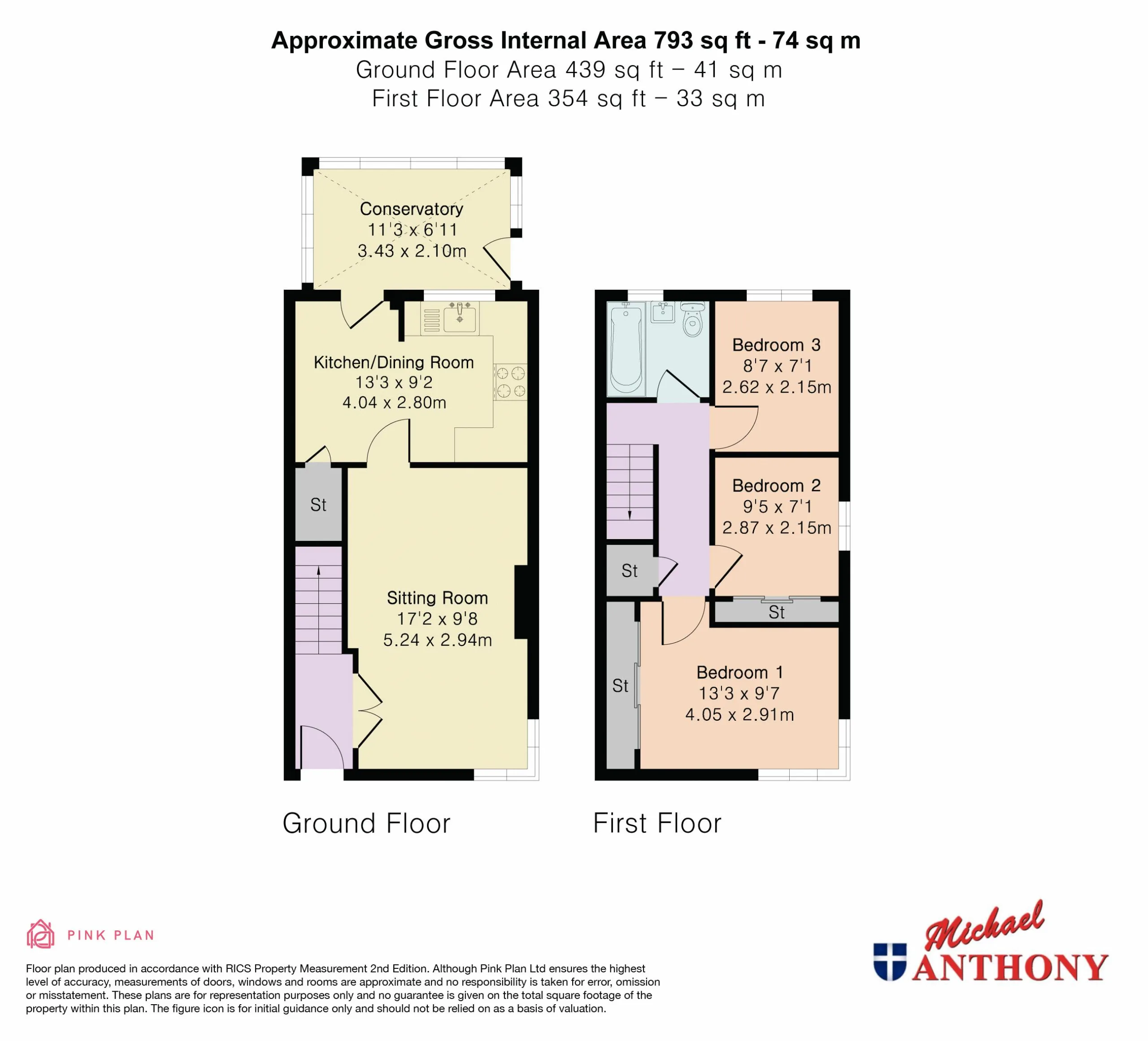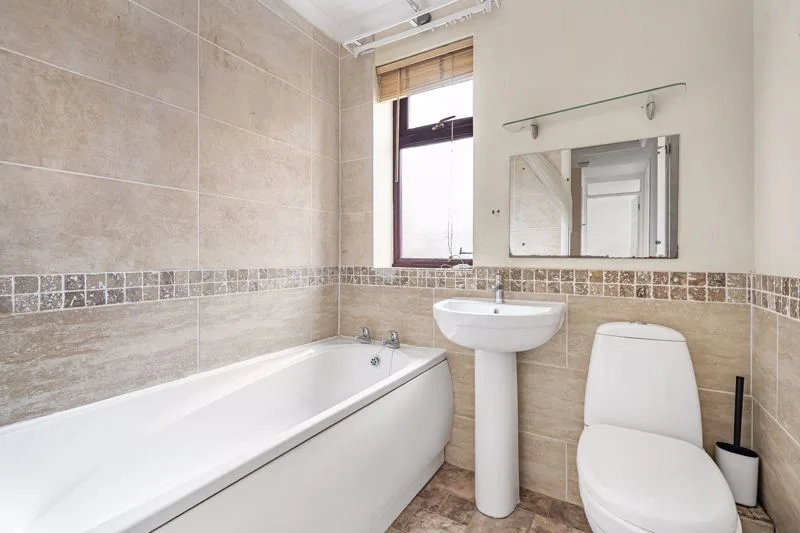 Double glazed frosted window to rear aspect. Panelled bath with shower attachment over, pedestal wash hand basin, low level WC, part tiled walls, radiator.
