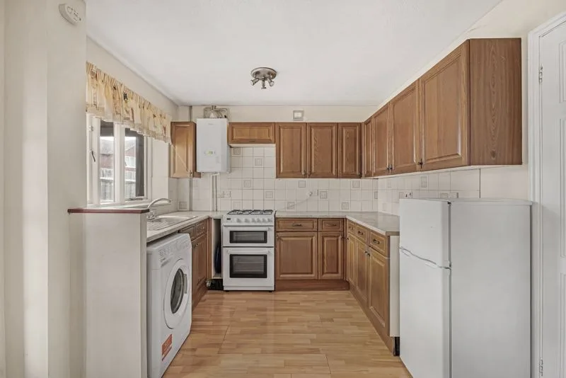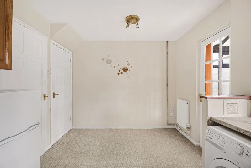 Fitted with a range of wall-mounted and floor standing units with rolled edge work surface over, space for fridge freezer and cooker, plumbing for washing machine, stainless steel sink unit with mixer tap and drainer, wall-mounted gas fired boiler, radiator, under stairs storage cupboard.