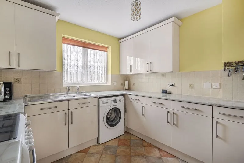 Fitted with a range of wall-mounted and floor standing units with rolled edge work surface over, space for cooker, plumbing for washing machine, stainless steel sink unit with hot and cold taps, space for fridge freezer, radiator, under stairs storage cupboard, door to side.