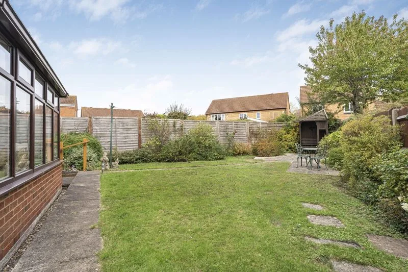 Mainly laid to lawn surrounded by panel fencing, gated side access, flower and shrub borders, door to garage.