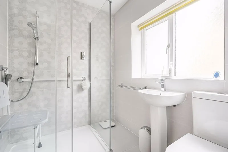 Double glazed frosted window to side aspect. Heated towel rail, shower unit, pedestal wash hand basin, low level WC, tiled walls.