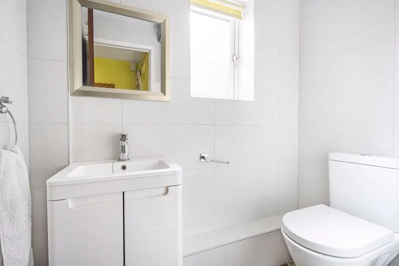 Double glazed frosted window to side aspect. Low level WC, wash hand basin in vanity unit, tiled walls, radiator.