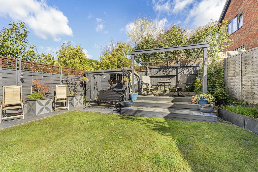 Mainly laid to lawn surrounded by panelled fencing, wooden decking area, outside light, cold water tap, timber storage shed.